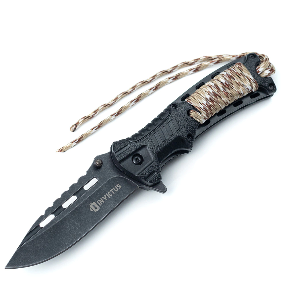 o Canivete INVICTUS Range se destaca por incluir em seu cabo pederneira e fiel em Paracord.